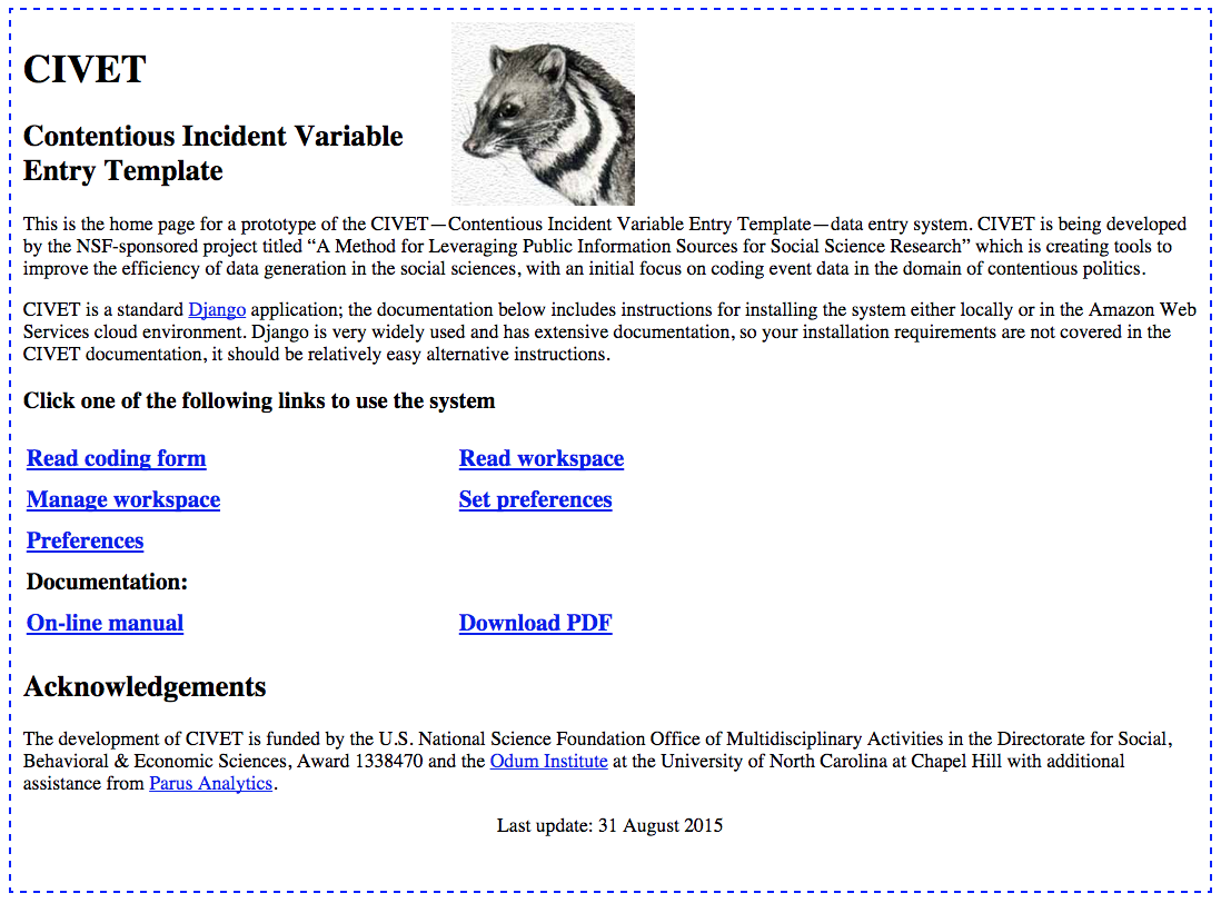 Because CIVET is still in beta, the version on GitHub is the one being used for development. To deploy the system for active coding, you will probably want to make the following changes: