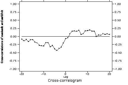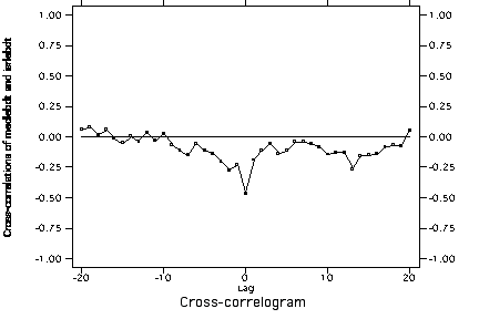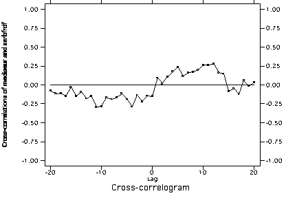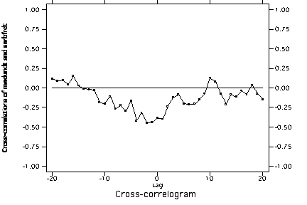 Cross-correlation of US mediation and Serbia->Bosnia cooperation with trend and autocorrelation removed from both series